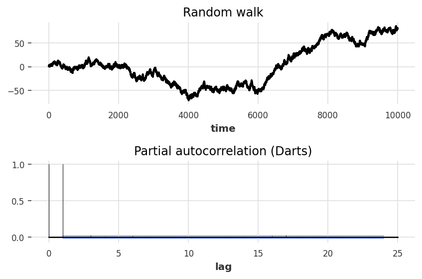- PACF (Partial autocorellation function) is zero for random walk except for lag 1